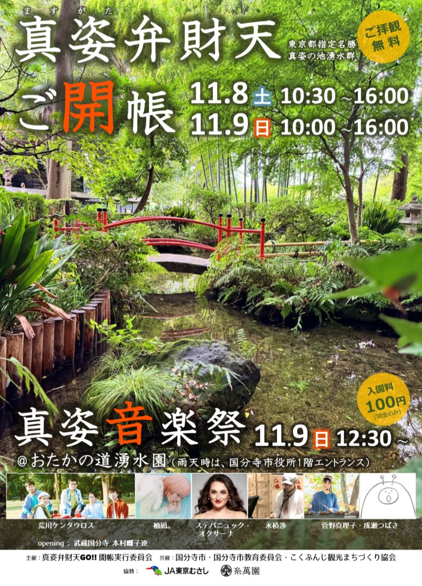 100円〔おたかの道湧水園入園料(中学生以下は無料)。現金のみ可〕 雨天時は国分寺市役所1階エントランスロビーで行います。